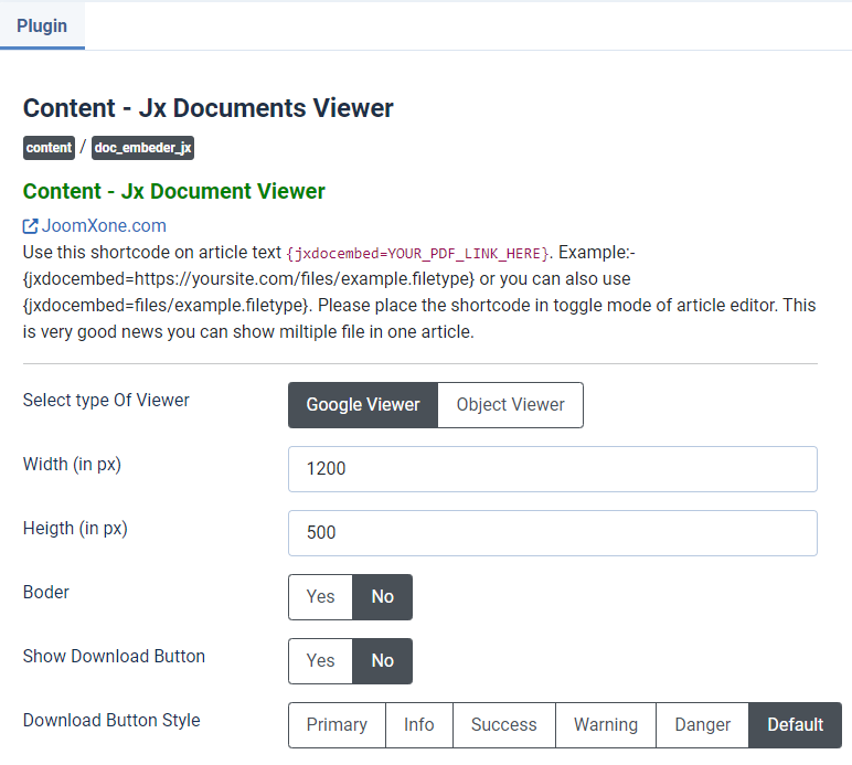 Jx Documents Viewer/embedder is an amazing short-code based Joomla Plugin that helps you to display/embed your documents at your Joomla site. The following plugin supports several file types - PDF, Excel, PowerPoint and Docx. Even you can display multiple files in a single article. The installation and configurations are too easy, even you might not need any documentation. The plugin supports both Joomla natives article and K2 items. Since this is a short-code based Joomla Plugin, You have to place the short-code anywhere in Joomla articles and K2 Items, and inside the short-code you have set your file path. The short-code is mentioned below.
