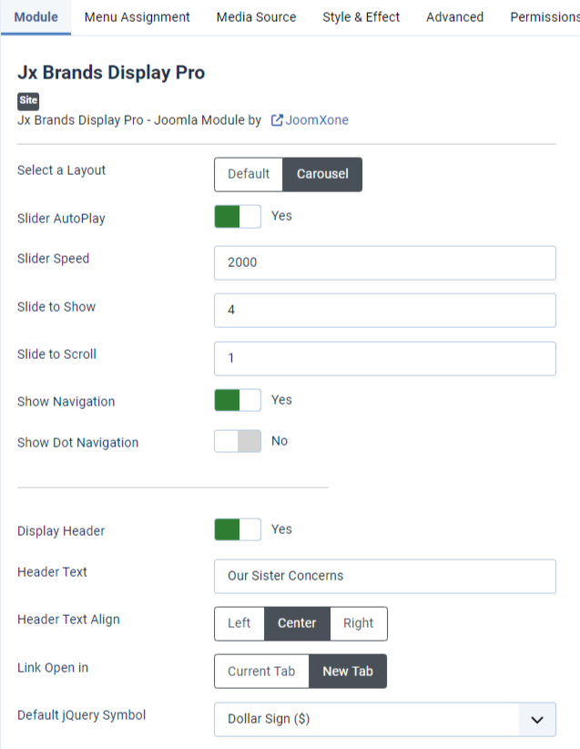 This is a light weight premium Joomla Module can be very useful to display Brand Logos to any Joomla website. This Module is fully responsive to fit any device. There are two layouts of this module - 'Default' that can display the logos in grid layout. Another one is 'Carousel' displays the logos in a carousel slider. This is the Pro version with lot more settings/features. There is a light/free version of this extnsion too. You can check the free version. The configuration of this extension is very easy -